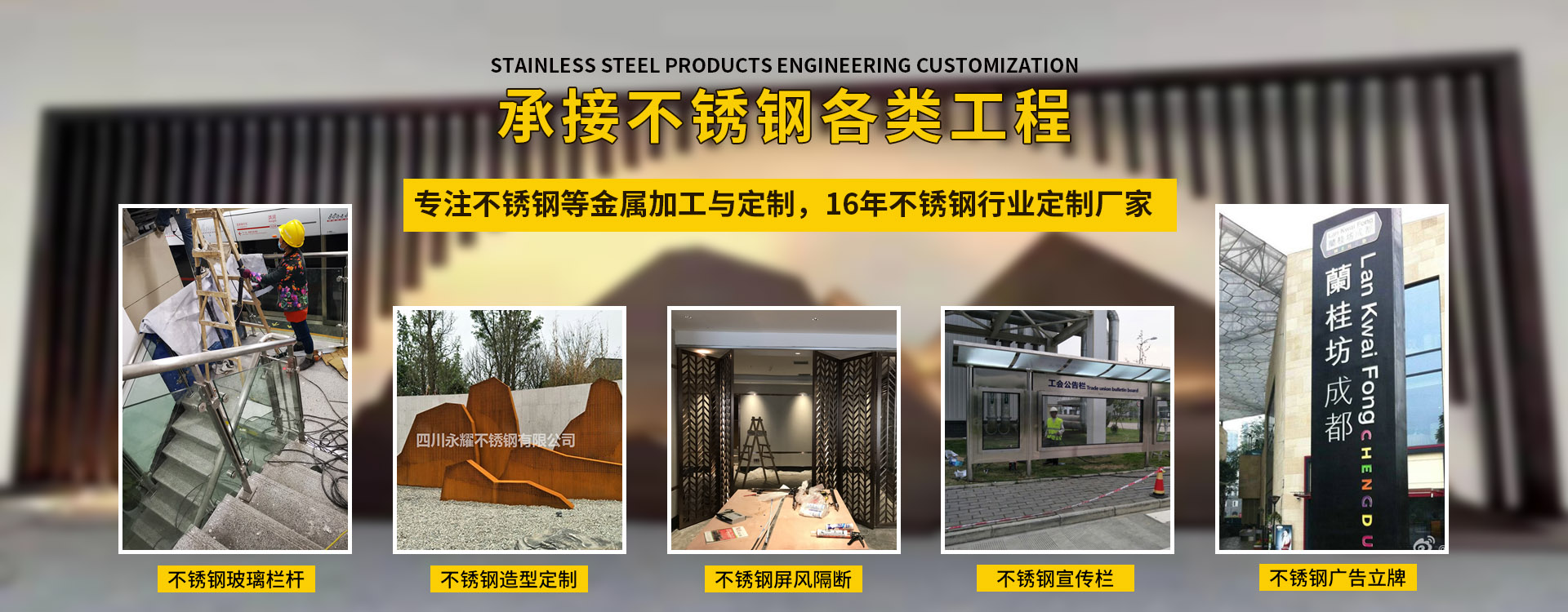 四川永耀不銹鋼有限公司是一家集開發(fā)、設(shè)計(jì)、加工、制作、安裝、并承接各種不銹鋼工程為一體的綜合性企業(yè)。多年來一直在專注于不銹鋼等金屬的加工與研發(fā)。在客戶群體中贏得了良好的聲譽(yù),以專業(yè)專注的精神,致辭力于打造良好的產(chǎn)品和企業(yè)形象,對(duì)每一產(chǎn)品傾注全力,力爭(zhēng)每個(gè)細(xì)節(jié)精細(xì),確保產(chǎn)品具有優(yōu)越的性能,優(yōu)美的外觀及優(yōu)良的品質(zhì),使公司產(chǎn)品深受廣大用戶的親睞。 本公司主要業(yè)務(wù): 一、工程類 承攬:酒店、銀行、商鋪、寫字樓、公寓、城鐵、地鐵、公交、機(jī)關(guān)、 學(xué)校、廣場(chǎng)藝術(shù)雕塑、自動(dòng)門、旋轉(zhuǎn)門、廣告欄、公